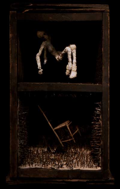 found box, plaster puppet, constructed chair, nails, newspaper